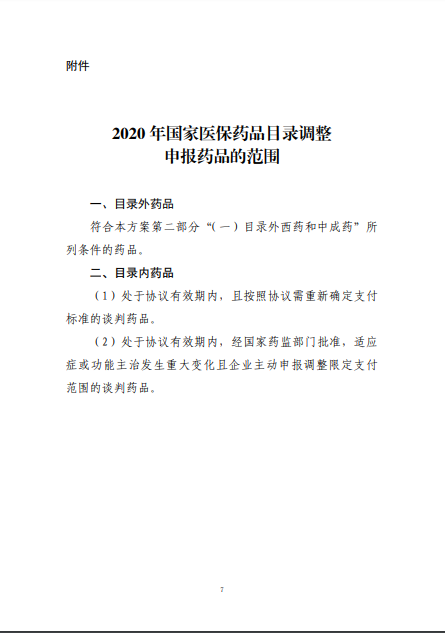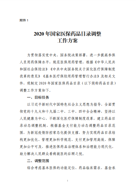 2020年8月3日-10日,国家医疗保障局就《2020年国家医保药品目录调整工作方案(征求意见稿)》向社会公开征求了意见。8月17日,《2020年国家医保药品目录调整工作方案》和《2020年国家医保药品目录调整申报指南》正式公布。